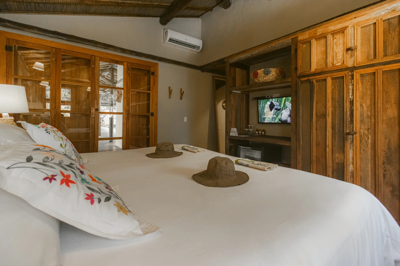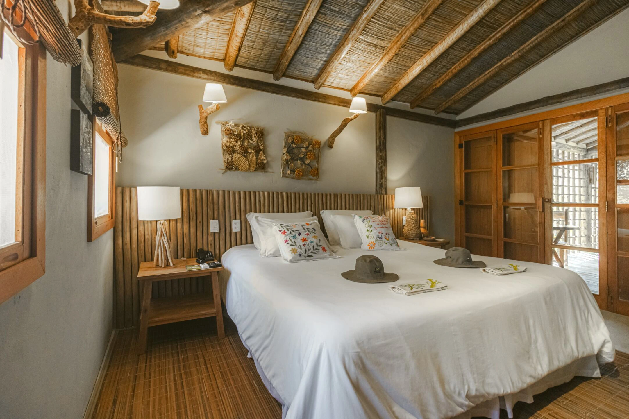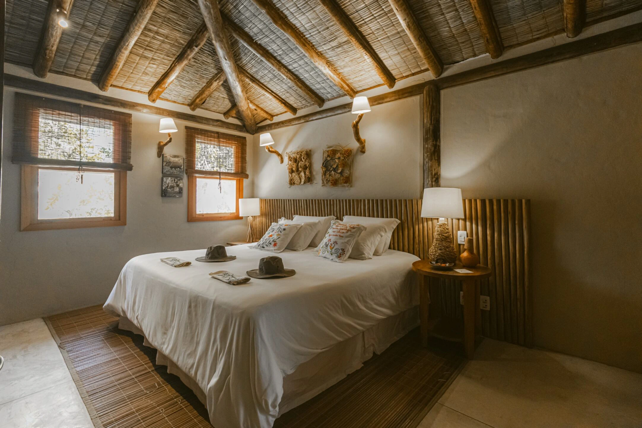 Conforto e sensação de estar em casa, em uma atmosfera integrada ao mundo selvagem lá fora. São apenas sete suítes, que contam histórias por meio de uma decoração rústica. Todas elas amplas, arejadas, confortáveis, silenciosas e equipadas com: cama king size, lençóis de algodão Trousseau, toalhas e roupões Trousseau, ar-condicionado, cofre, frigobar, amenities da da marca Souvie – que são orgânicos e naturais, com as certificações Ecocert Organic Cosmetic e Cosmos Organic.