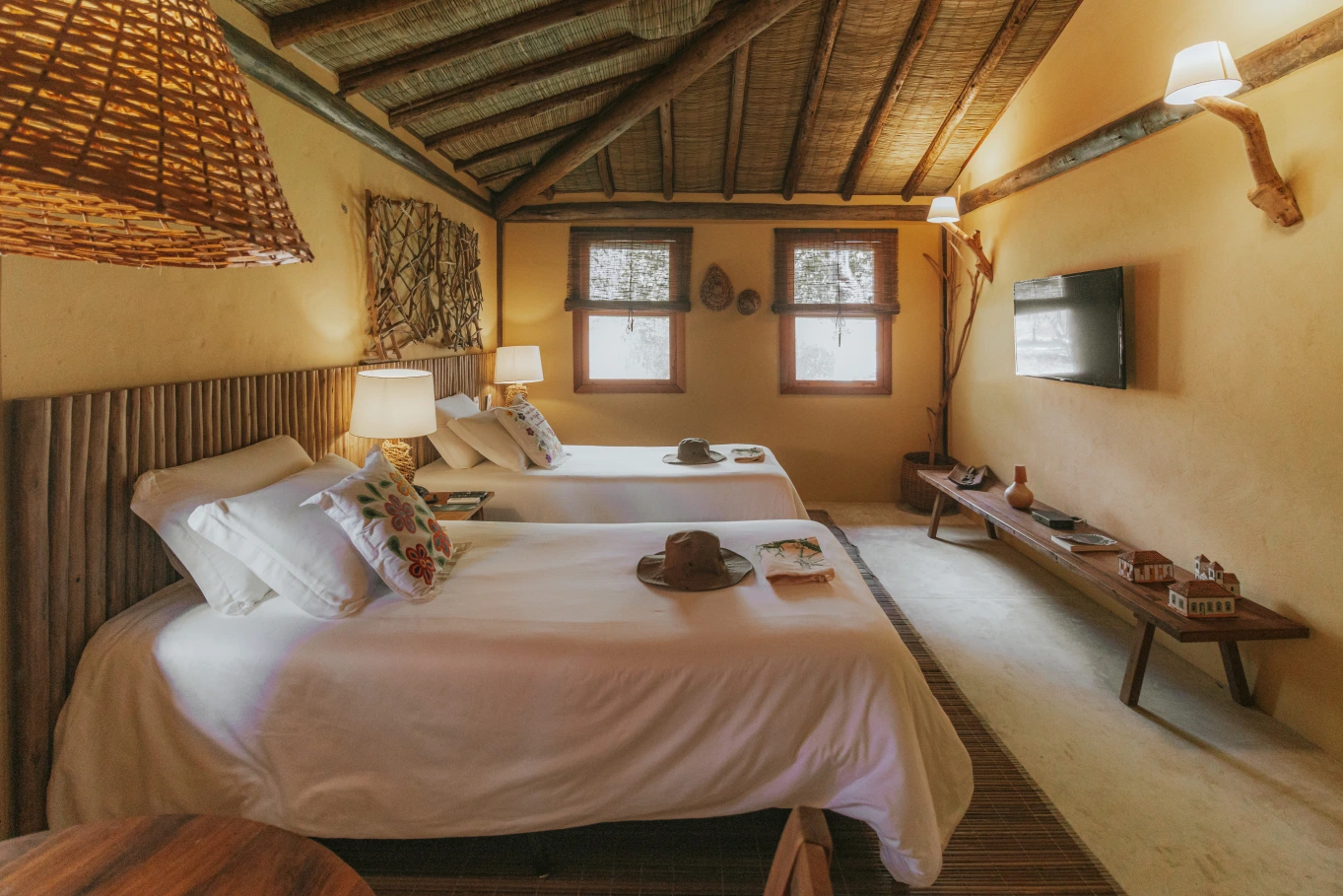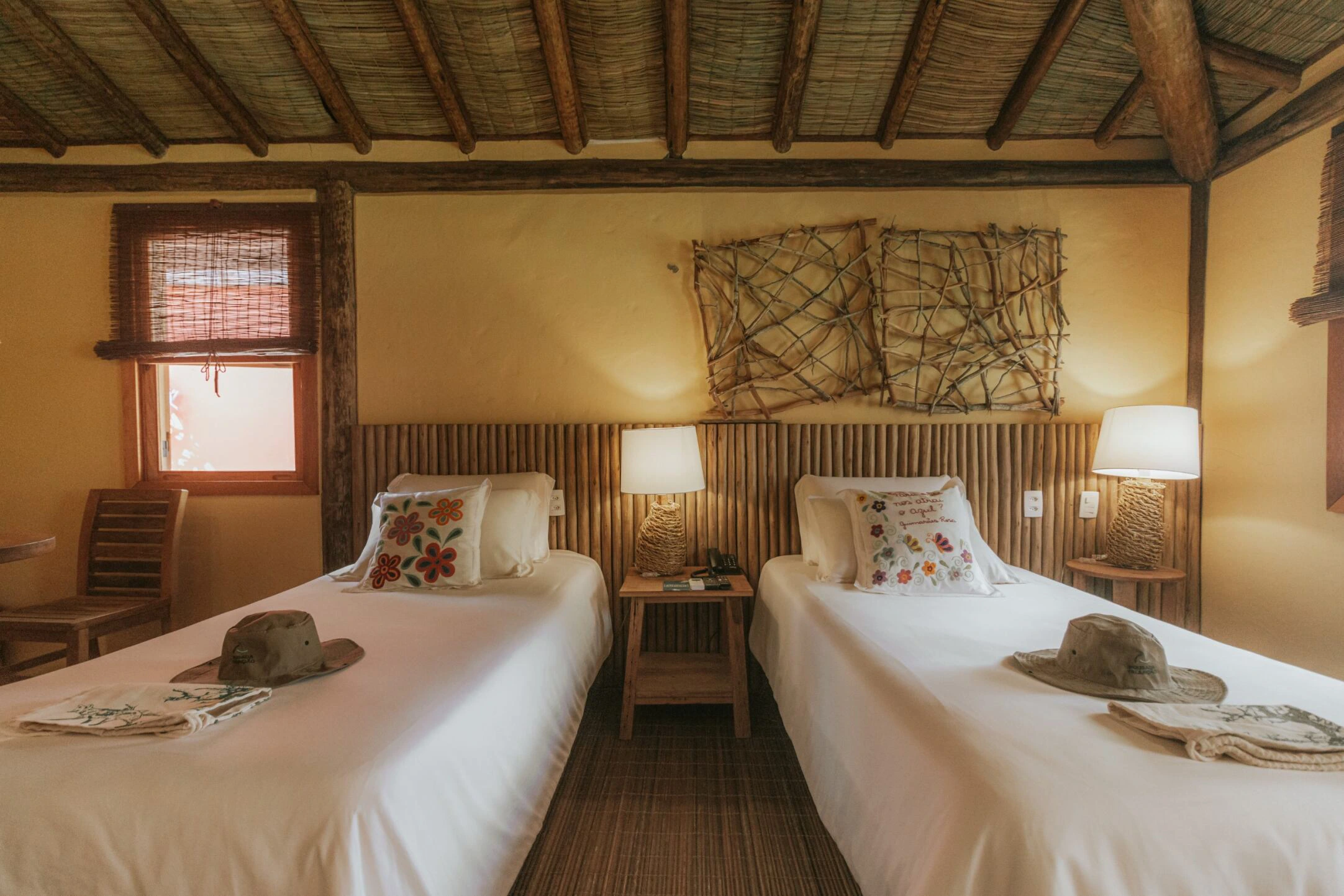 Três suítes acolhedoras com um toque de Cerrado por todo lado. Acomodam, confortavelmente um casal, com a possibilidade de adcionar uma cama de solteiro.